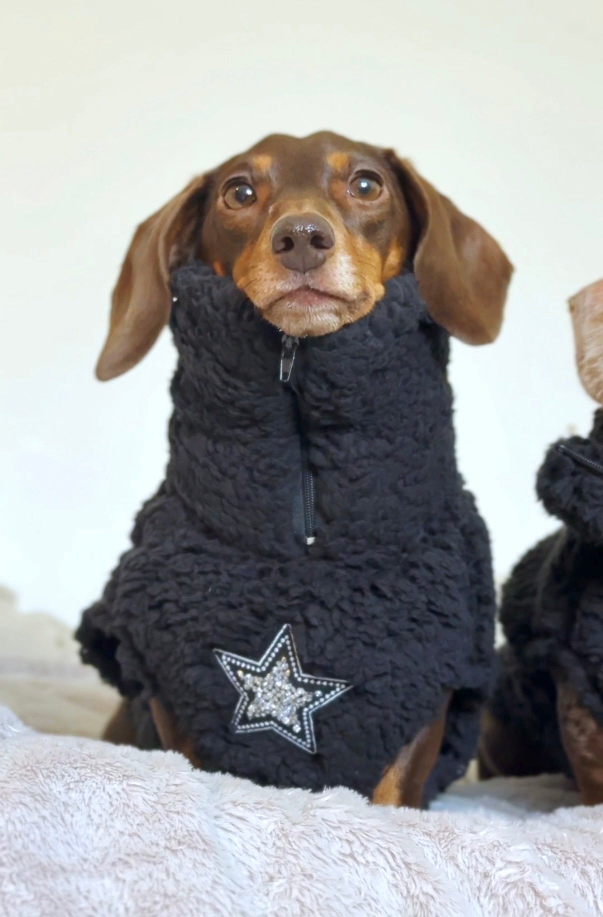 Meet The Midnight Star Jumper — a cosy, timeless essential designed to keep your dog warm, comfortable, and effortlessly stylish. Crafted from ultra-soft black fluffy fabric, this jumper features a practical quarter-zip design for easy dressing and a subtle star detail ⭐ for a refined finish.