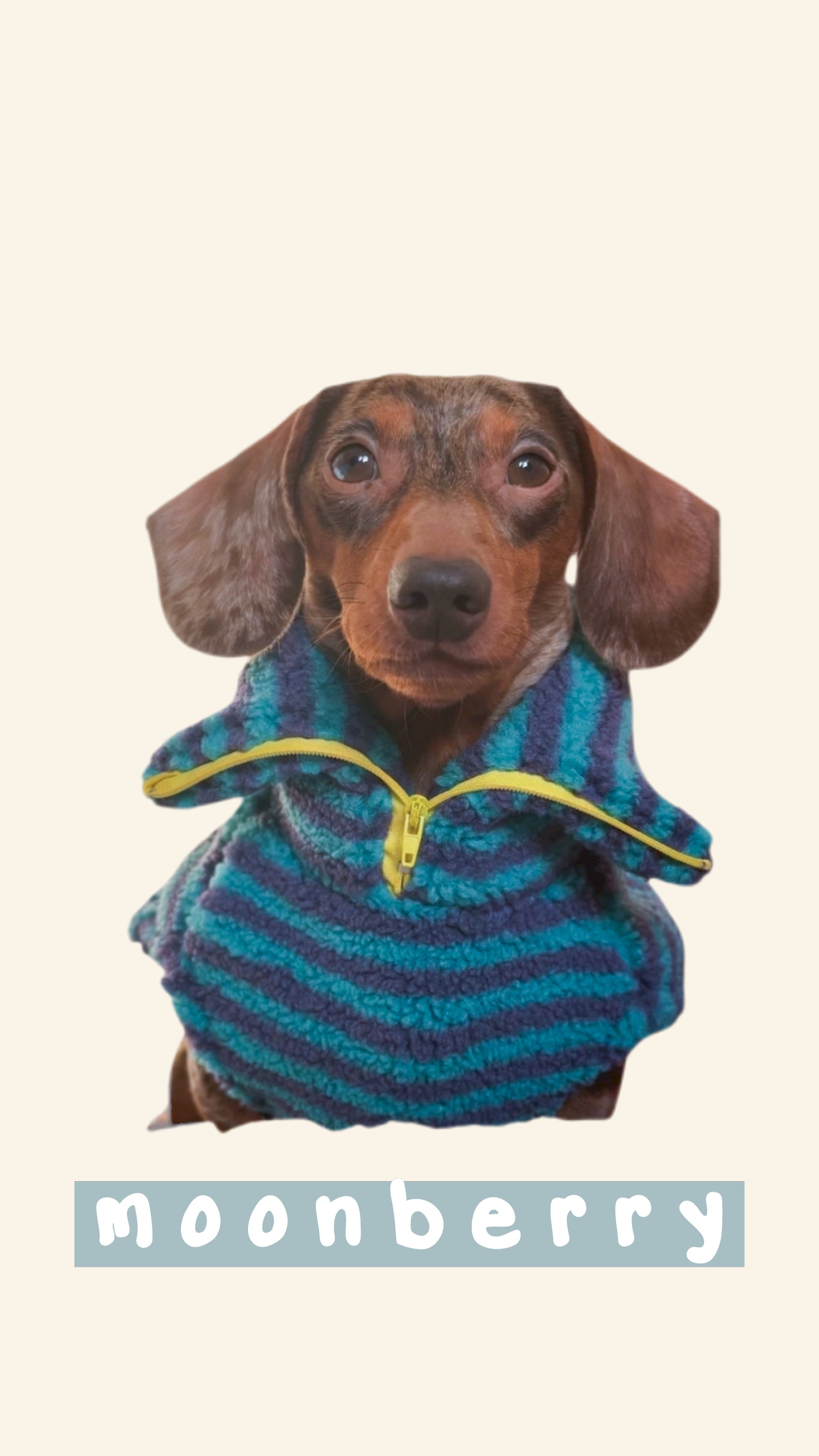 - Moonberry – Teal & navy stripes with a white or yellow zip